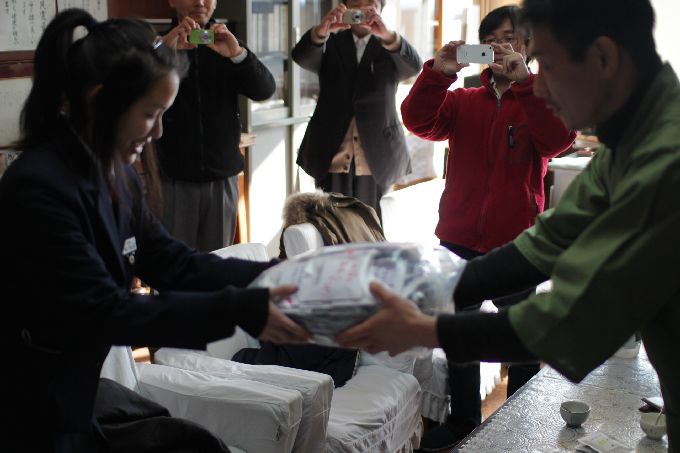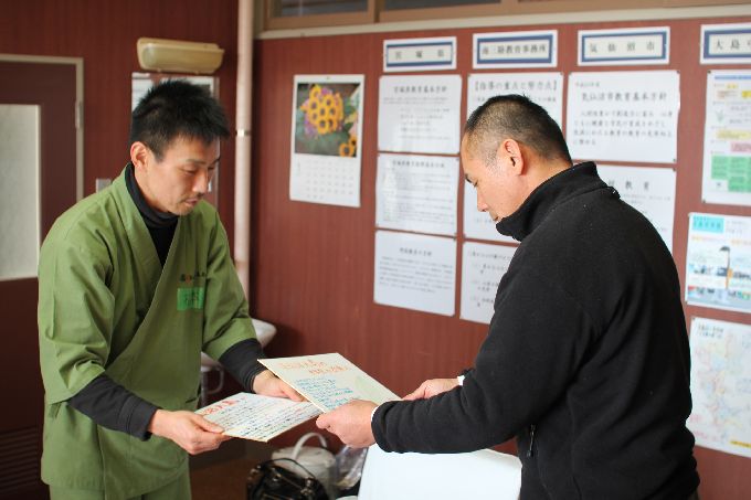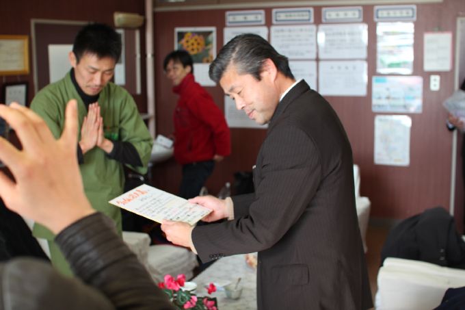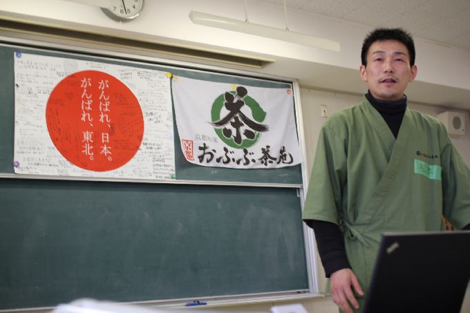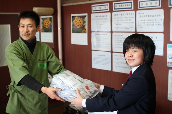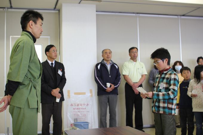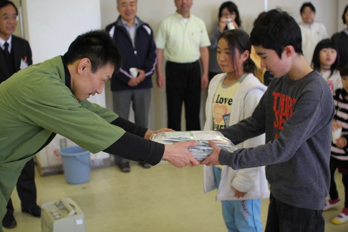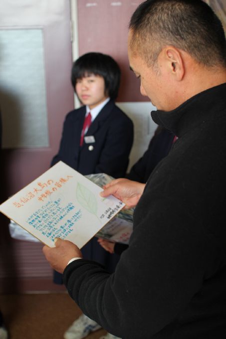 この日は、京都・和束の小・中学生に、このお茶キャラバン出発前に、気仙沼大島の小・中学生宛てに書いてもらったメッセージと中学生が育てて、収穫した宇治和束茶を届けします。