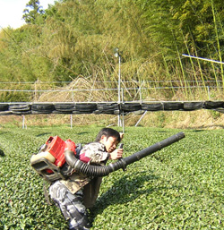 | 春は、お茶にとって新芽が吹き出し、 新茶を収穫する新しい季節です。 そんな季節に竹のやろうは・・・落葉するのです(涙) なんて厄介なやつなんでしょう。 今度、茶畑を見かける機会があったら、 その茶畑では、きっと毎年、竹の落ち葉と沈黙の戦いを | ![]() ブロアで竹の落ち葉を飛ばす |