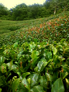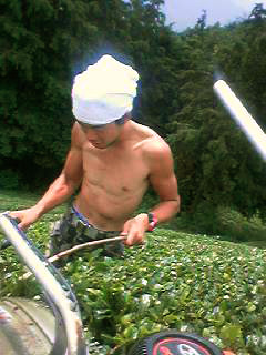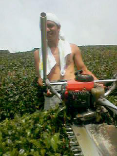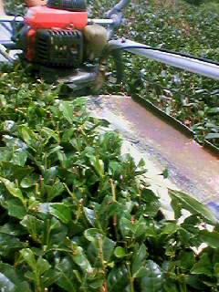 | 夏に向かって、茶の木は、春とはまた違った勢いで、 成長してゆきます。 春に新茶を刈った後の茶畑も 新茶を収穫したあとに再び出てきた新芽は、 | ![]() 番茶刈りの様子 今回は、刈りほかしです。 |