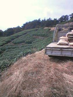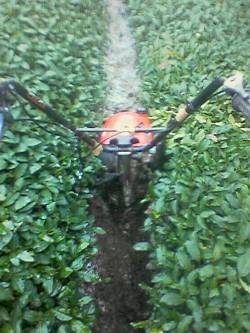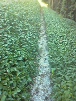 そしてこの油かすを 背中に背負っているリュックがちょっと特殊で、 | ![]() お茶の木の畝間(うねま)を歩くあっきー 背中の赤いリュックには肥料が満載 |