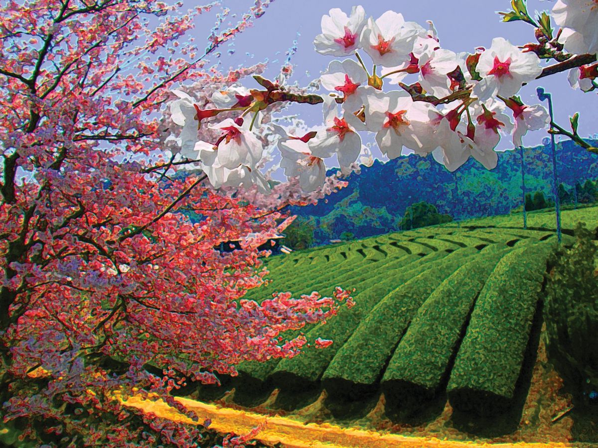【絵画風】桜と茶畑