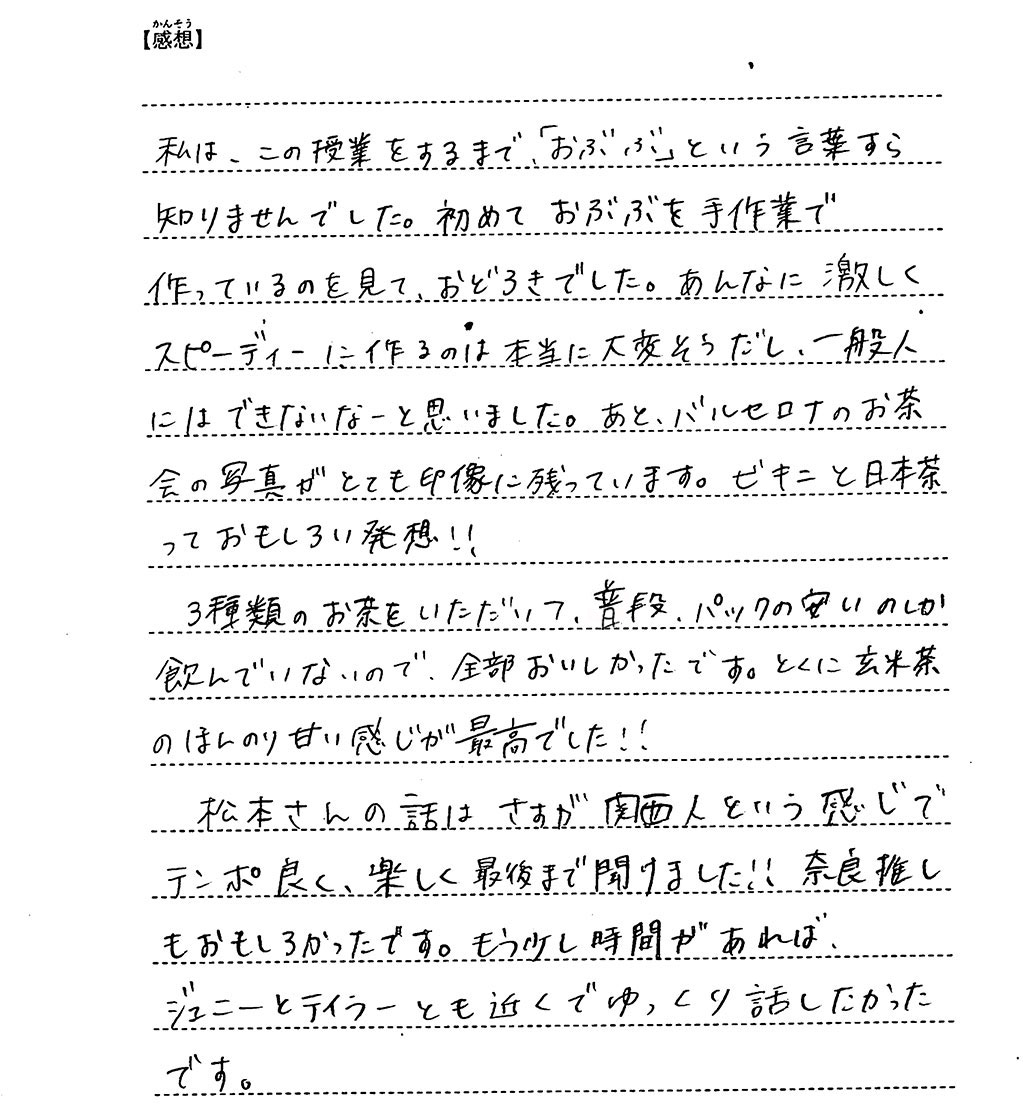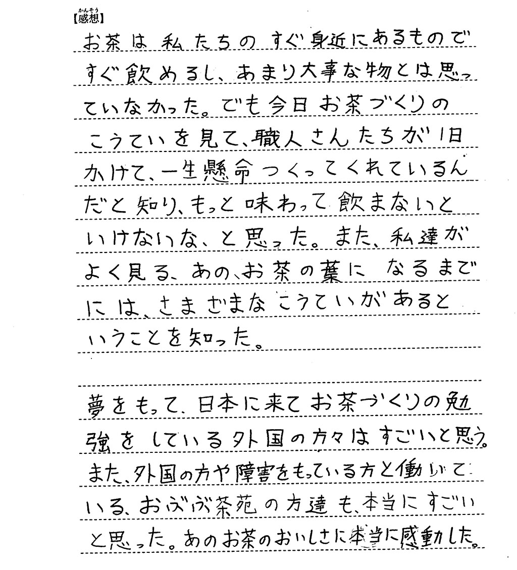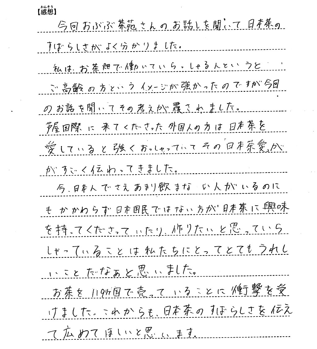 生徒の皆さんにはお話をお聴きいただくとともに、ほうじ茶、かぶせ煎茶、玄米茶の3種類を楽しんでもらいました。