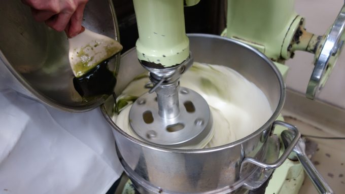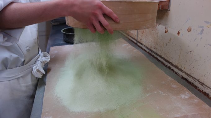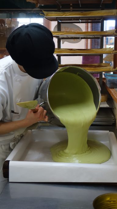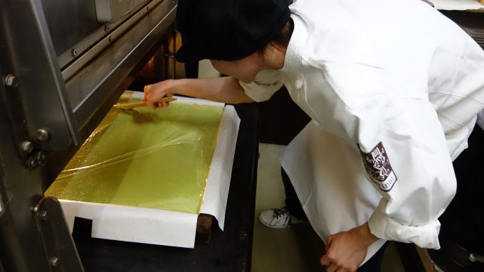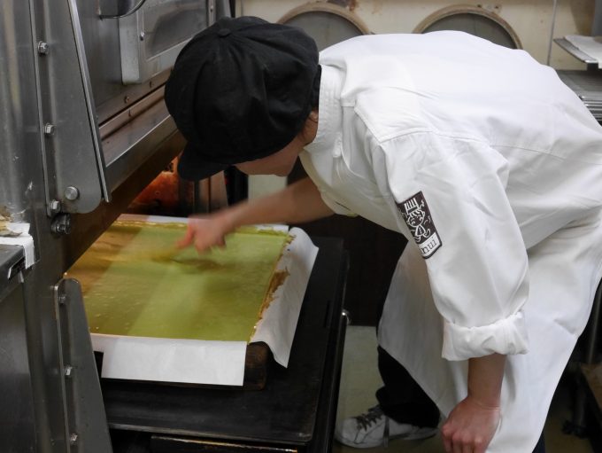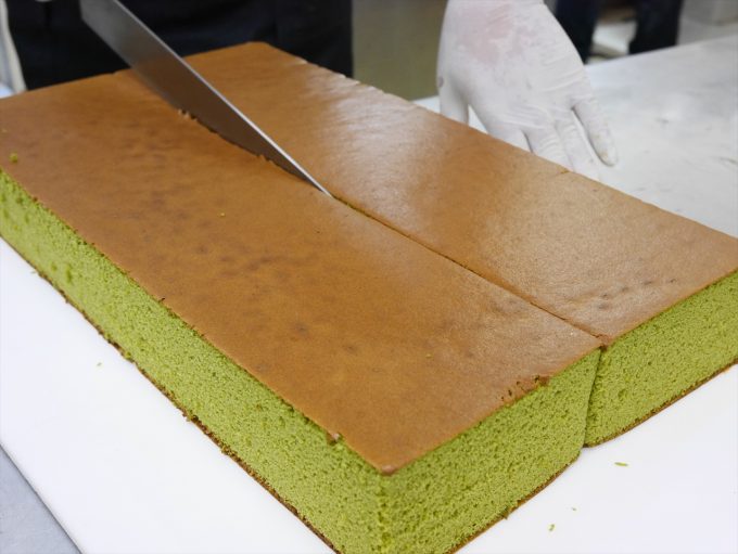 仕上げをする乾さん綺麗にカットされたカステラ、抹茶の緑が美しい!!