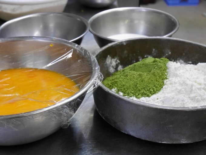 小麦粉、おぶぶの抹茶 卵、生クリーム、抹茶みつ、すべて混ぜ合わせ、生地が完成しました。大きな木型に流し込みオーブンにいれます。焼きあがるまでに3度生地の焼き加減が均一になるよう混ぜます。約30分ほどで完成!!