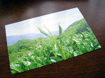 そして、【おぶぶNEWS】を読んでくださっている方には、特別にプレゼントをご用意! 右の絵はがきなのですが、映っているのは、ちょうど春の収穫の風景。 そしてこの収穫風景は、敬老の日セットにお付けしているかぶせ煎茶を、まさに収穫している風景です。(写真、中央左に小さくうつるのは、当店の店長あっきーです♪) |