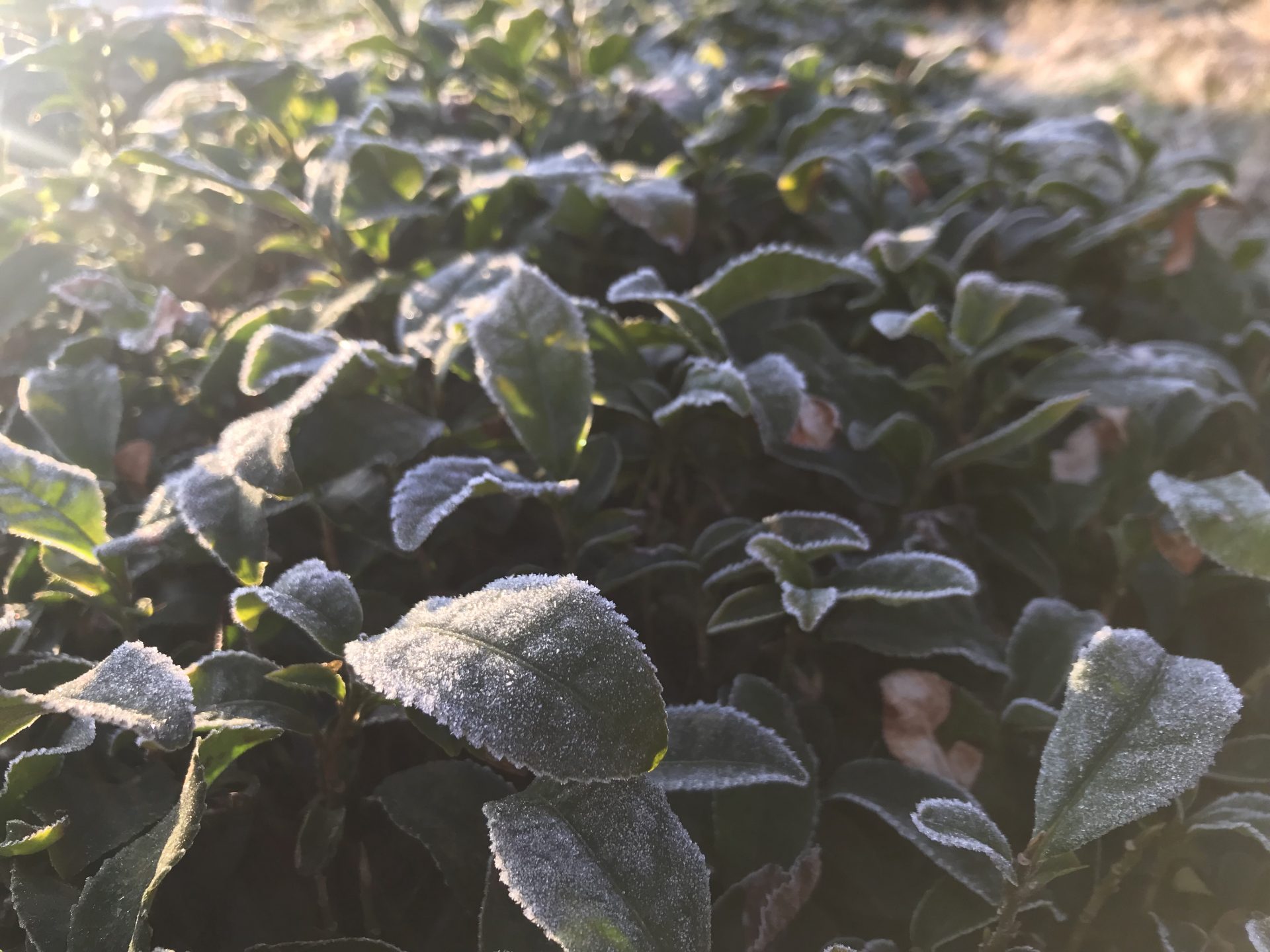 冬を越した茶葉(古葉:ふるは・新芽ではなく、硬化した親の葉っぱ)は、霜が降りても、凍りついて枯れたりしません。