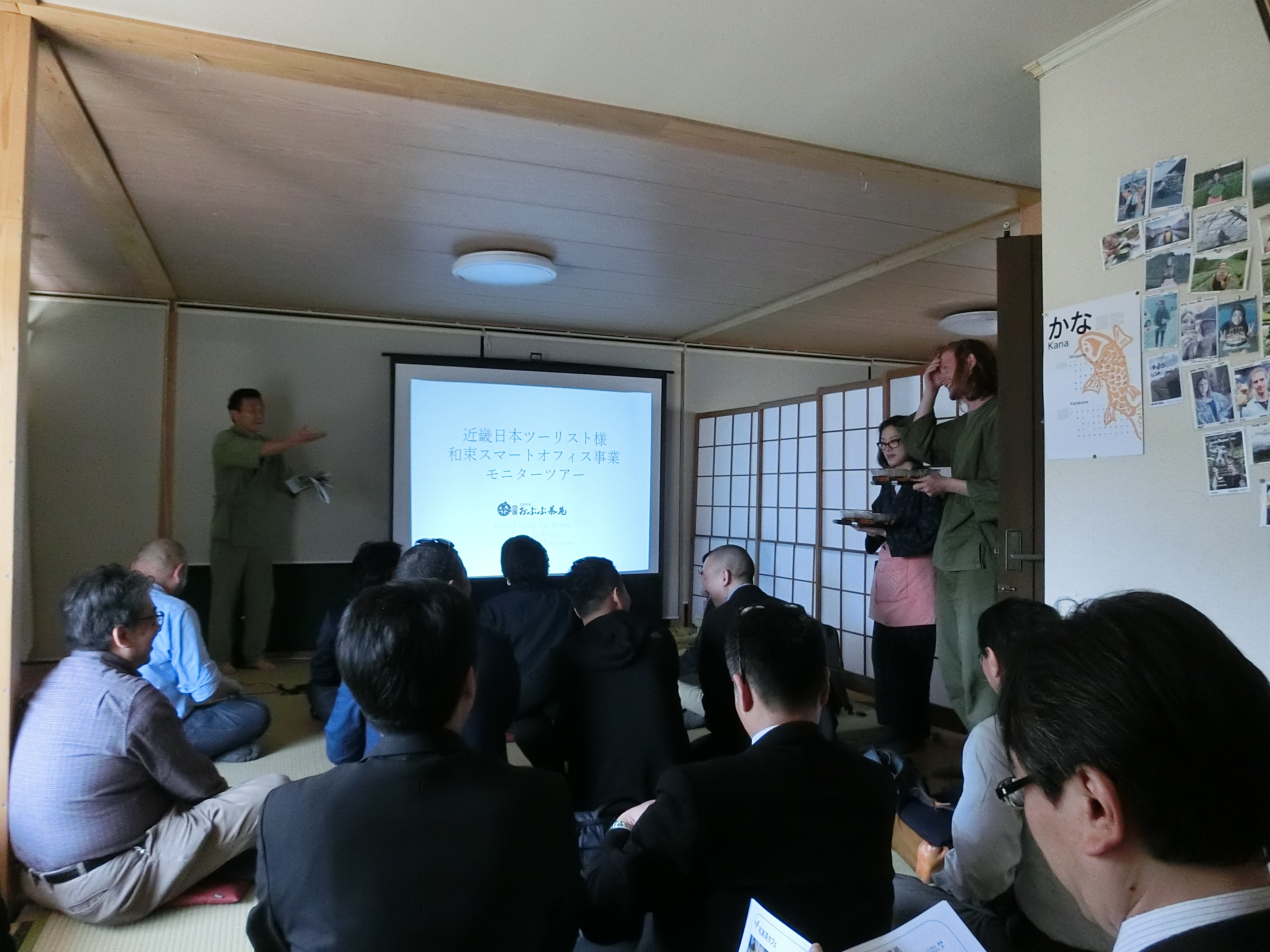 この事業の委託を受けているのが近畿日本ツーリスト様でして、この日は、和束町でのテレワークを推進するために東京や京都で活躍するインターネット企業やフリーランサーの方、京都府庁、和束町役場の方々など19名が視察に来てくださいました。