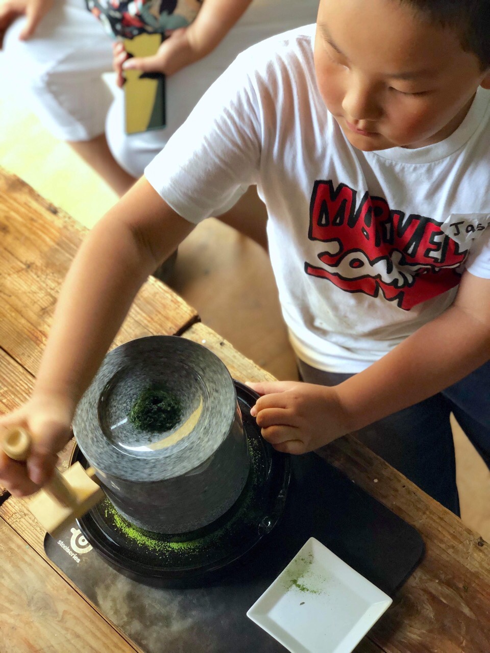 石臼で「碾茶」(抹茶の原料で収穫した茶葉を碾茶工場にて製茶し、茎を葉脈を取り除いた乾燥した茶葉)を、碾(ひ)き抹茶を点てて楽しんでいただいたり、