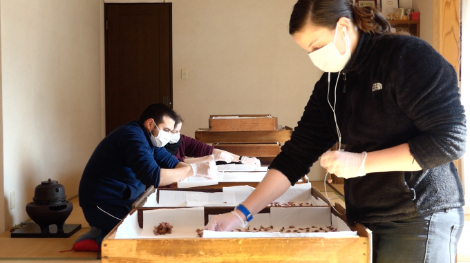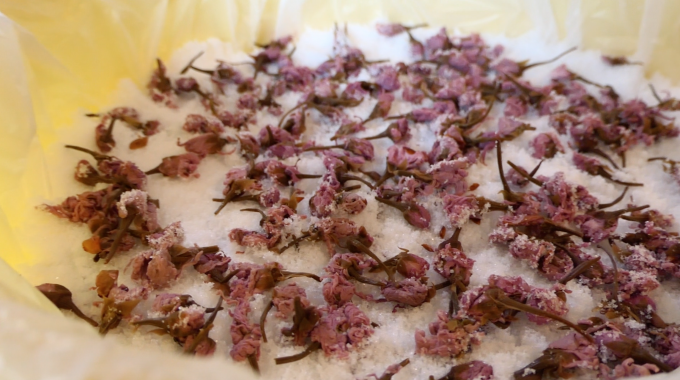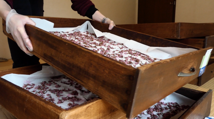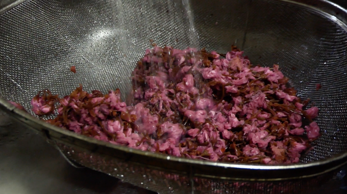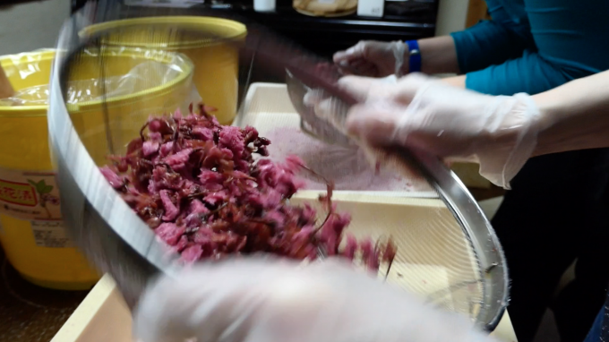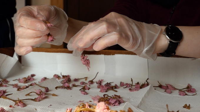 古式製法によって作られた塩味の桜茶を脱塩して、2日間水に浸けた後に、茎をもぎり、乾燥させた桜のつぼみに砂糖をまぶすという簡単そうな作り方ですが、実はかなり細かくてたくさんの注意の必要な過程なのです!