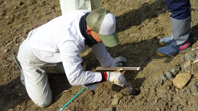 目標の目印の位置から両側に交互に千鳥に植えていきます。