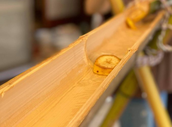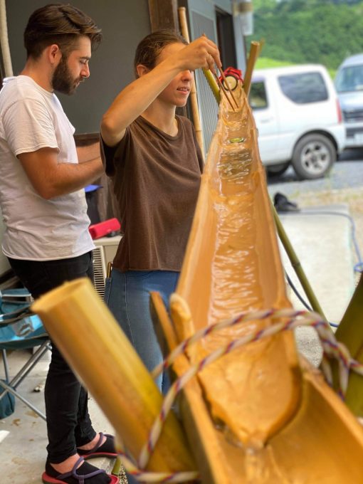 新鮮な竹をみんなで切り、節を取り、なめらかに仕上げます!