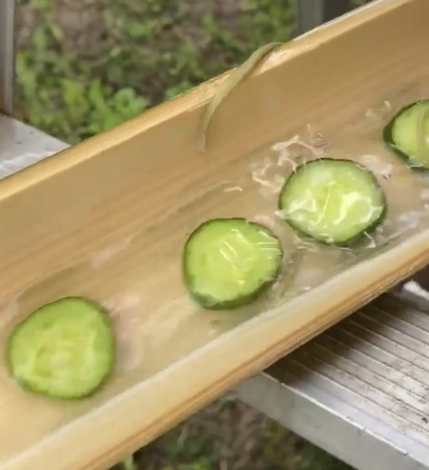 流しそうめんは、竹を利用して水路を作り、上流からそうめんを少しづつ入れ、流れて来たそうめんをみんなでキャッチして食べる、というものです。