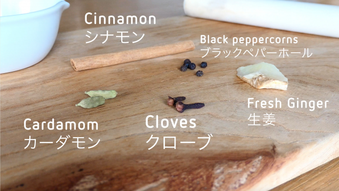 ① まな板の上で、カルダモンの種を潰し、生姜を細かく切ります。シナモンスティックは手で折っておきます。