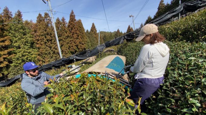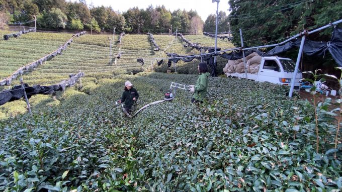 この作業は主に一番茶の収穫後に行います。葉っぱがある部分は全て刈り落とすことによって、茶の樹の高さを低くし作業を行いやすくするうえに、お茶の樹の枝を更新ができ、もっと品質の良い芽を取れます!