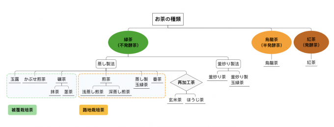 お茶の種類は、お茶の発酵度合い・製法・栽培方法によって分類できます。味や風味も全く違うので、数種類を飲み比べてみるのも面白いのではないでしょうか。