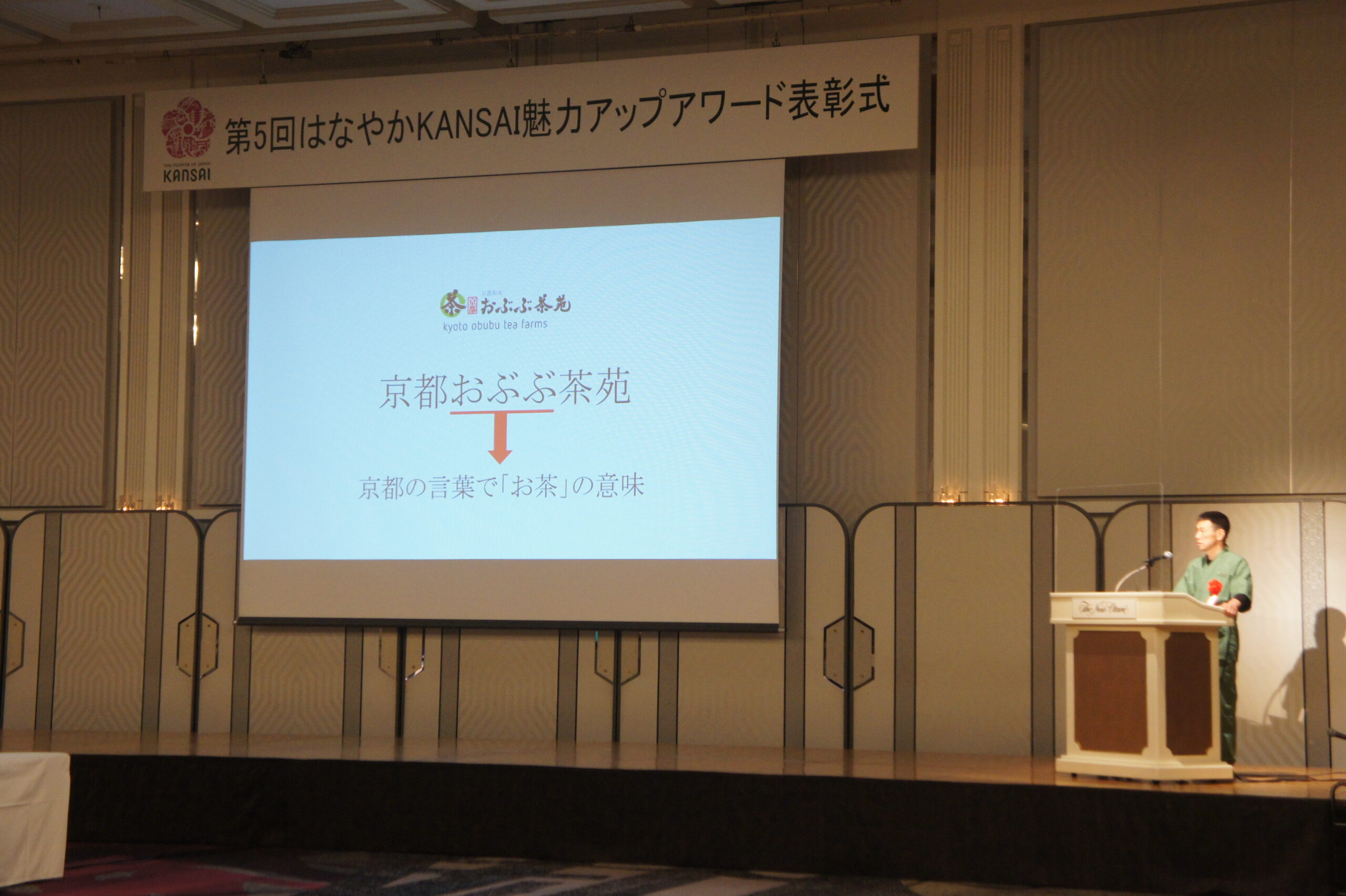 この日は、経産省近畿経産局主催「はなやかKANSAI魅力アップアワード」表彰式がホテルニューオータニ大阪にて開催されました。そして、ありがたいことに京都おぶぶ茶苑が、特別賞(新規性・独創性部門)を受賞させていただきました。