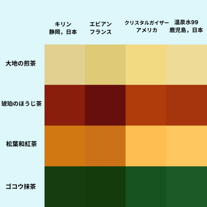 また、前回のエビアンとキリンの実験に立ち返るとすべてのお茶は(抹茶はともかく)エビアンの方が色が濃くなっています。