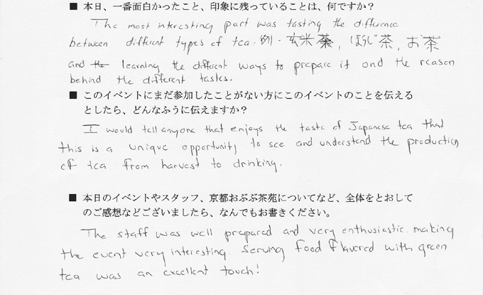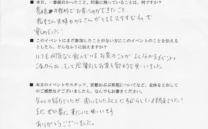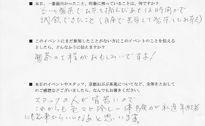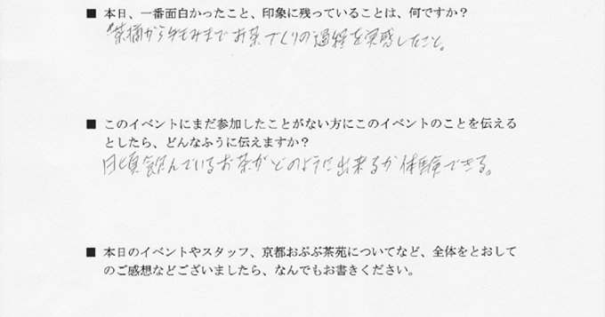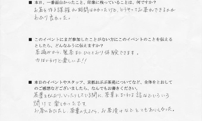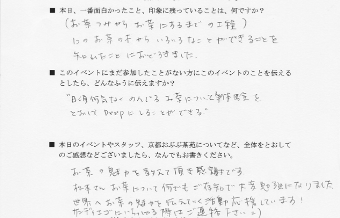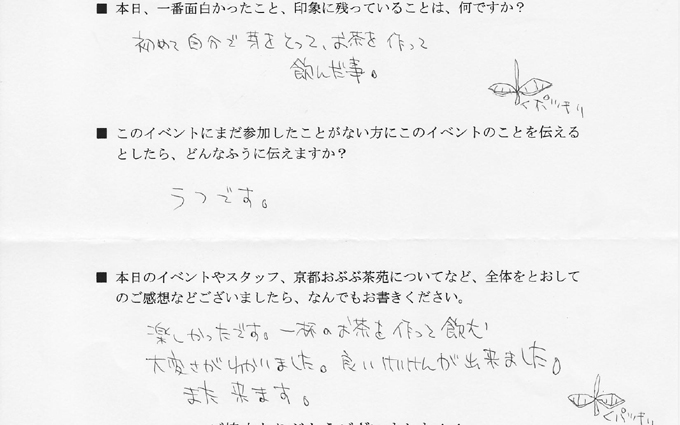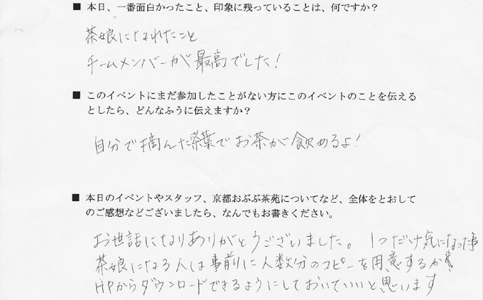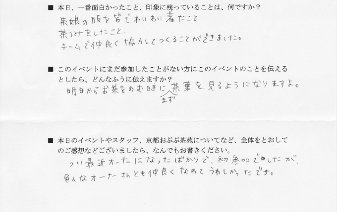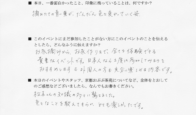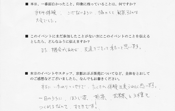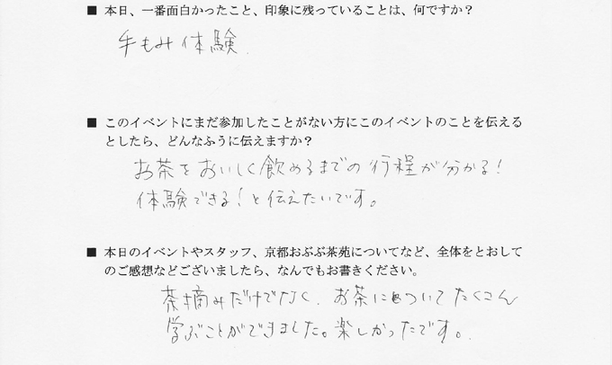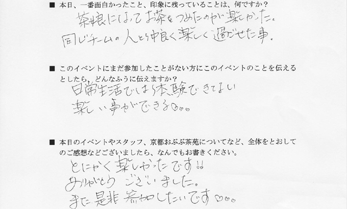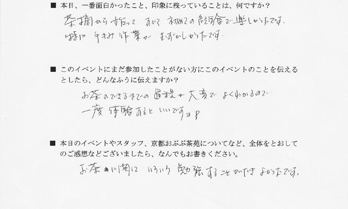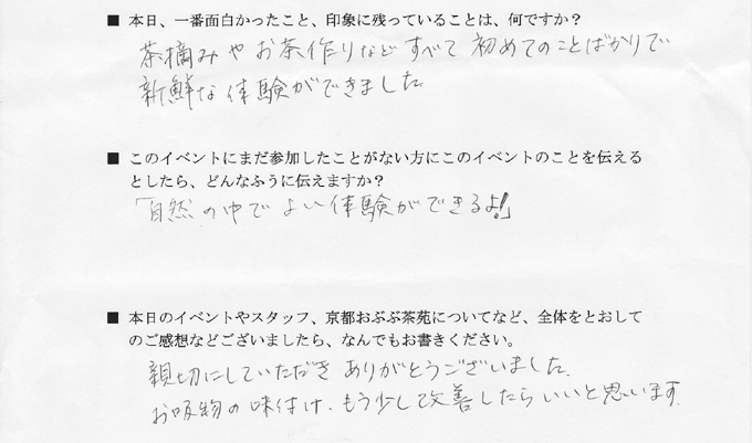 秋の茶摘体験にご参加くださった皆さまが、書いてくださった、ご感想です。
