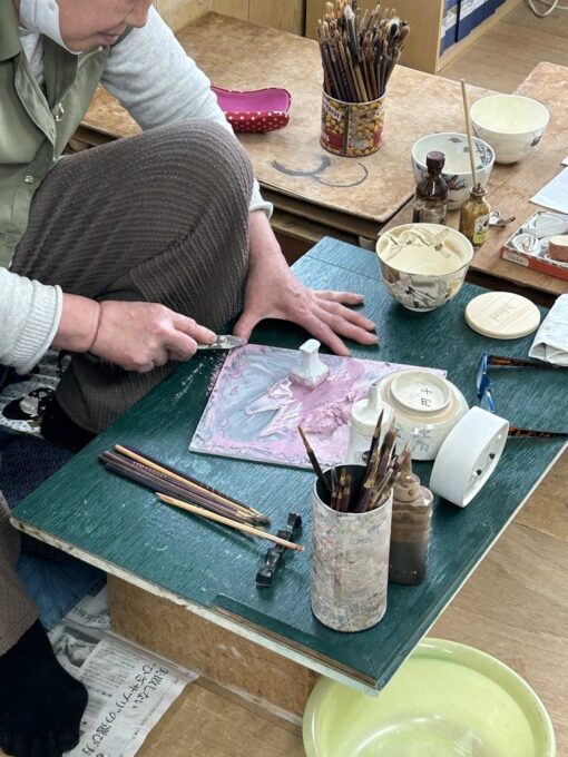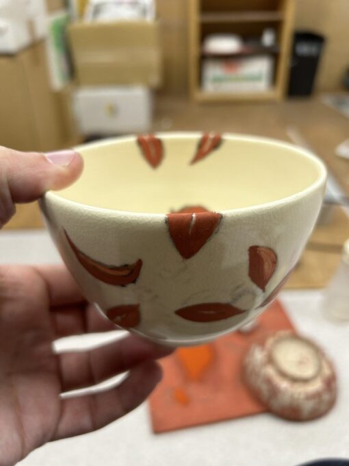 そこでは自分で茶碗の絵付けを体験しました。私はわたしの好きな季節である秋の茶葉をモチーフにした絵付けに挑戦しました。絵を描くのは得意ではありませんが、とても楽しく茶碗の絵付けについて多くのことを学びました(しかしとても難しいです)。