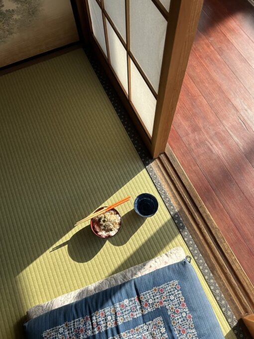 おぶぶでの新しい生活も少し落ち着いて最初にしたことのひとつが、茶室で緑茶と温かいご飯に色々な食材をトッピングをして食べたことです。おぶぶでの生活にまた戻ってこれたことは、私にとってとても感慨深いことでした。畳や紙の壁、茶器に囲まれた茶室に漂う癒しのエネルギーが私はいつも好きでした。