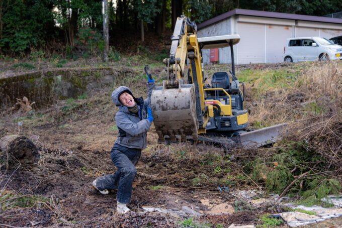 ここはクラファンで行っているプロジェクトの一環で、使っていなかったここの場所を駐車場として使うべく今綺麗に整地しているところです!