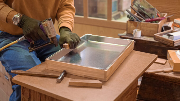伐採、乾燥、計測、裁断、組み合わせ、磨き、トタン貼り、和紙貼り、乾燥。