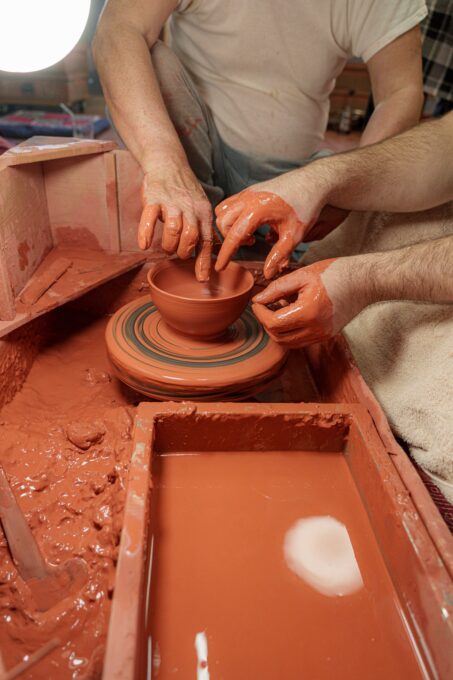 まずはロクロの真ん中に土を置いて、中心を定めます。
