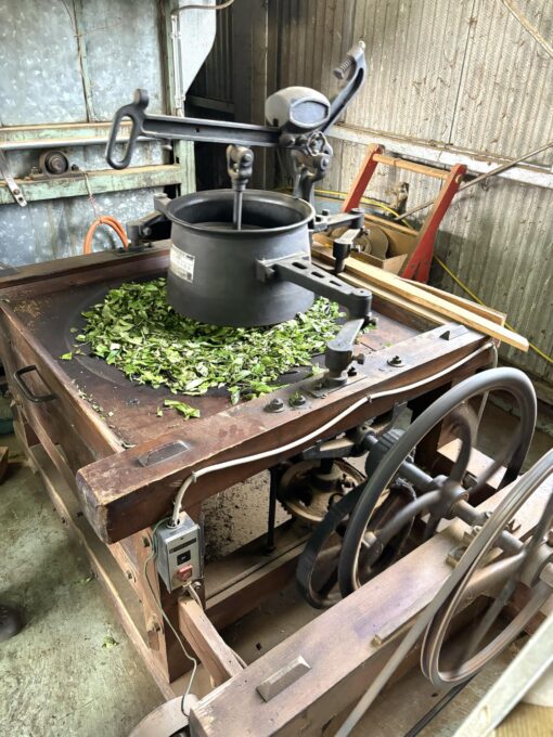 揉捻機にかけて、葉を揉み、葉の細胞壁を壊して酸化反応を起こし易くします。