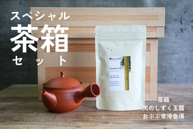 おぶぶオリジナルでレーザー彫刻を施した茶箱!おぶぶオリジナル常滑急須とおぶぶ最高品質の玉露「天のしずく玉露」と一緒にお届けします。