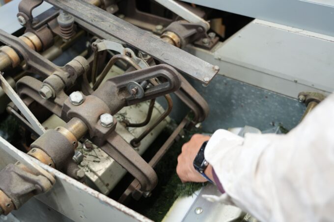 その後、和束町の共同工場へ移動し製茶が開始。工場スタッフさんの指導のもと丁寧に丁寧に1つづつの製茶が行われていきました。いつも製茶するスピードと比べると格段にゆっくりなスピードで機械が動いていたのでとても驚きました!機械をゆっくり動かす理由は、なるべく風を当てずに揉むことで上乾きを防止したり、葉の表面が摩擦で擦れないように、艶を出すためにしていると教えてもらいました。