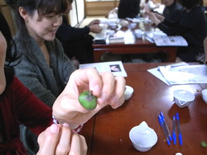 和束での開催と違って、生の茶畑には触れていただけないので、生のお茶の実を摘んで持って行きました。