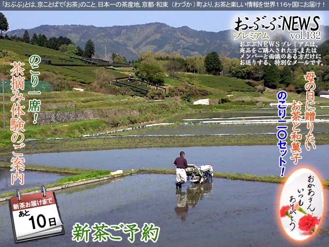 メルマガバックナンバー【おぶぶNEWS】2009 年 5 月 13 日5/13 新茶お届け開始! メルマガバックナンバー【おぶぶNEWS】2009 年 5 月 2 日5/2 本日、八十八夜。 メルマガバックナンバー【おぶぶNEWS】2009 年 4 月 28 日4/28 三連覇!そして、まだ間にあう母の日。 メルマガバックナンバー【おぶぶNEWS】2009 年 4 月 20 日4/20 母の日に贈る言葉