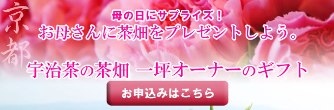 お母さんに京都・宇治茶の茶畑を 京都の茶畑・一坪オーナー権に 今年の母の日は、特別なギフトで |