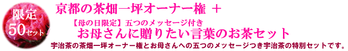 今回の茶畑オーナーギフトには、【母の日限定】お母さんをとびきり喜ばせるメッセージつきの五種類の宇治茶をお付けいたします!」