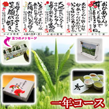 一年間・茶畑一坪のオーナー権と母の日限定の五種類のメッセージ付『言葉のお茶』がセットになった、オススメセット。