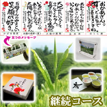 継続的な茶畑オーナー権と母の日限定の五種類のメッセージ付『言葉のお茶』のセット。ちょっとしたギフトを継続的にお母さんに贈りたい方にオススメ。