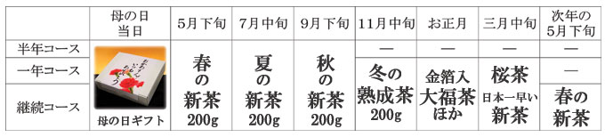 母の日当日に届くものは、基本的に同じですが、茶畑オーナーの期間が異なります。