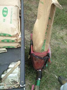 肥料のなたね油粕を、どっさりランドセルに入れているところ。