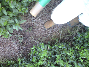 筒先をぐるぐる振り回してるんでー、足袋に肥料のってまう~